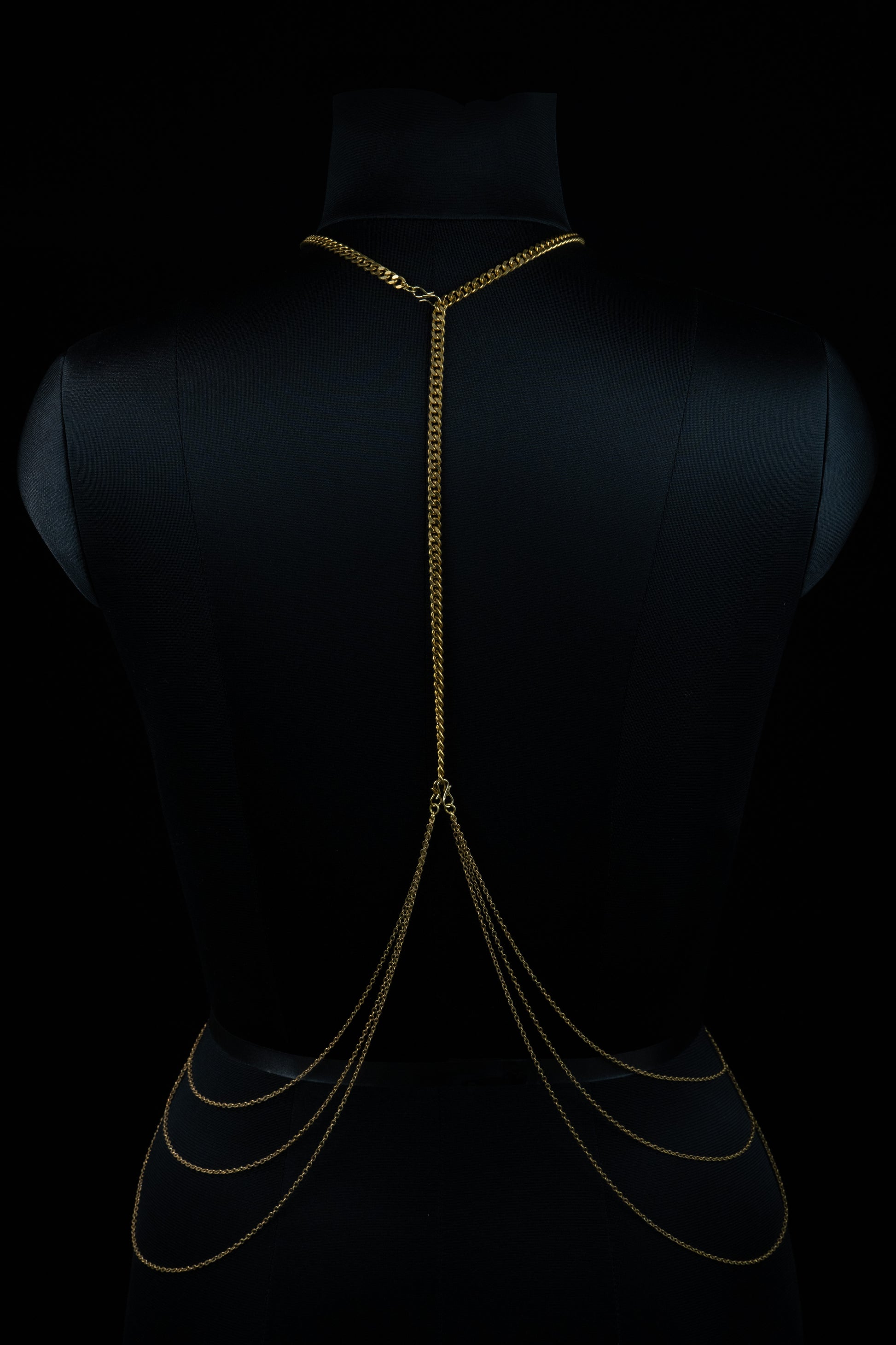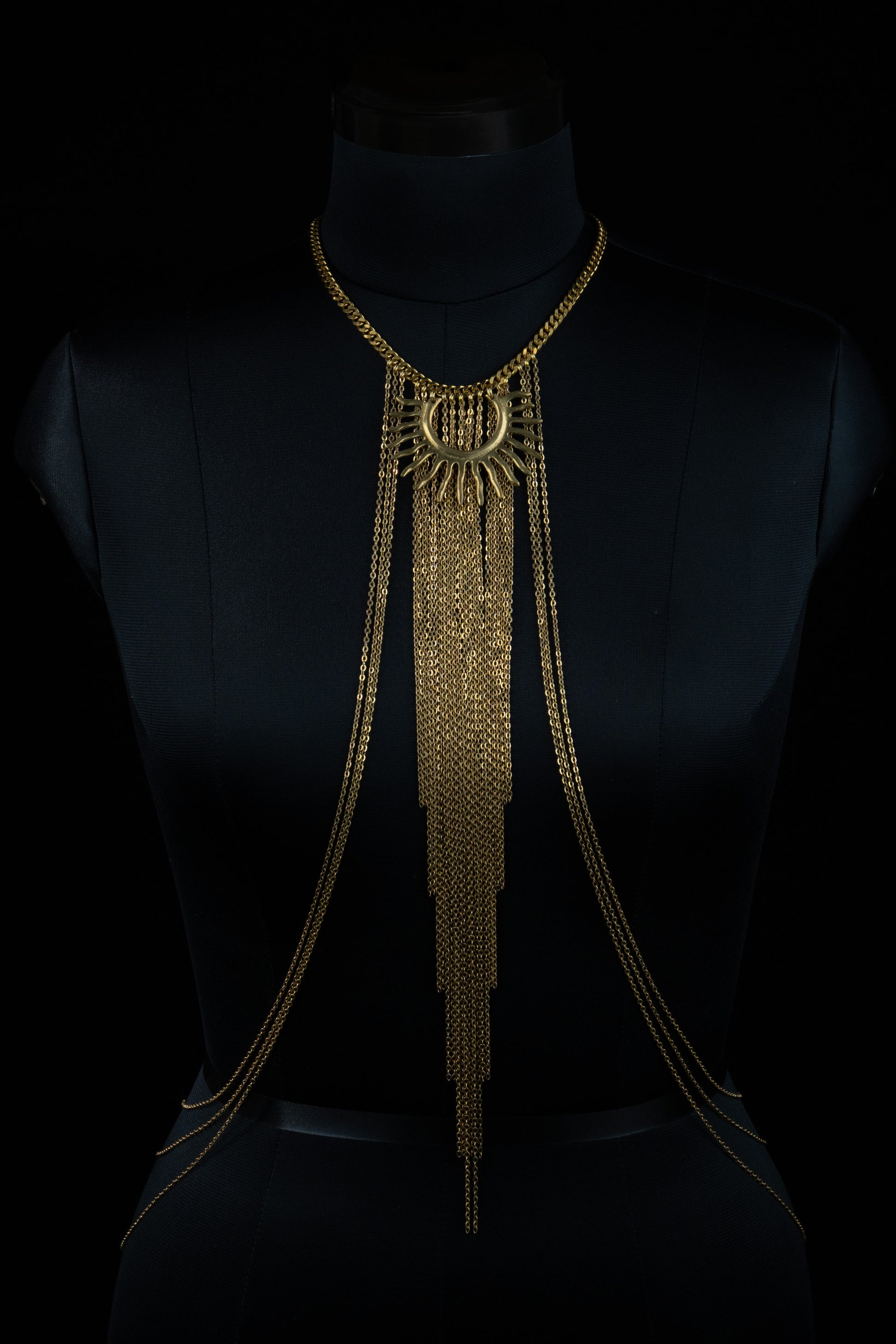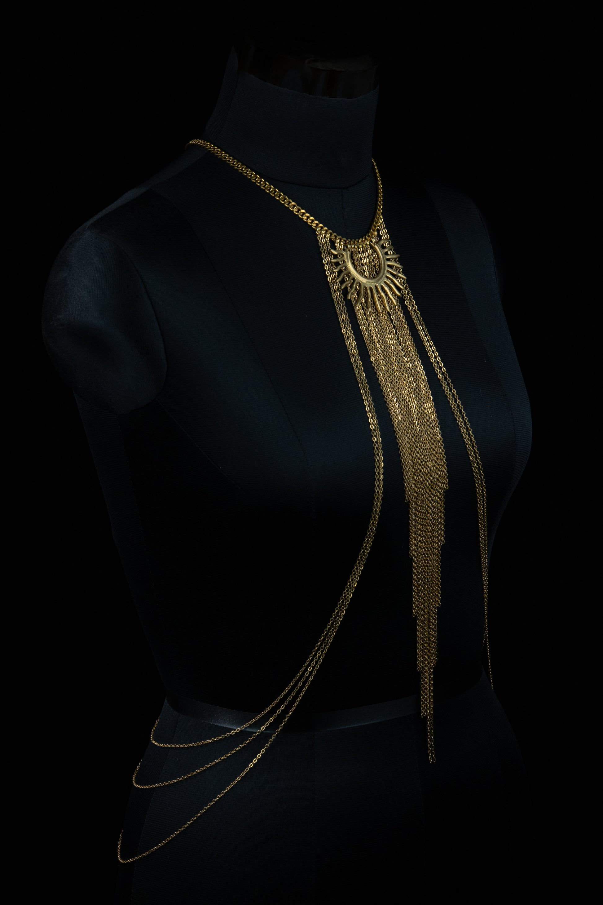 Handcrafted from brass chain, Solar Veil drapes the body in a cascade of sunlit strands, crowned with a radiant crest—like wearing the whisper of a summer eclipse.