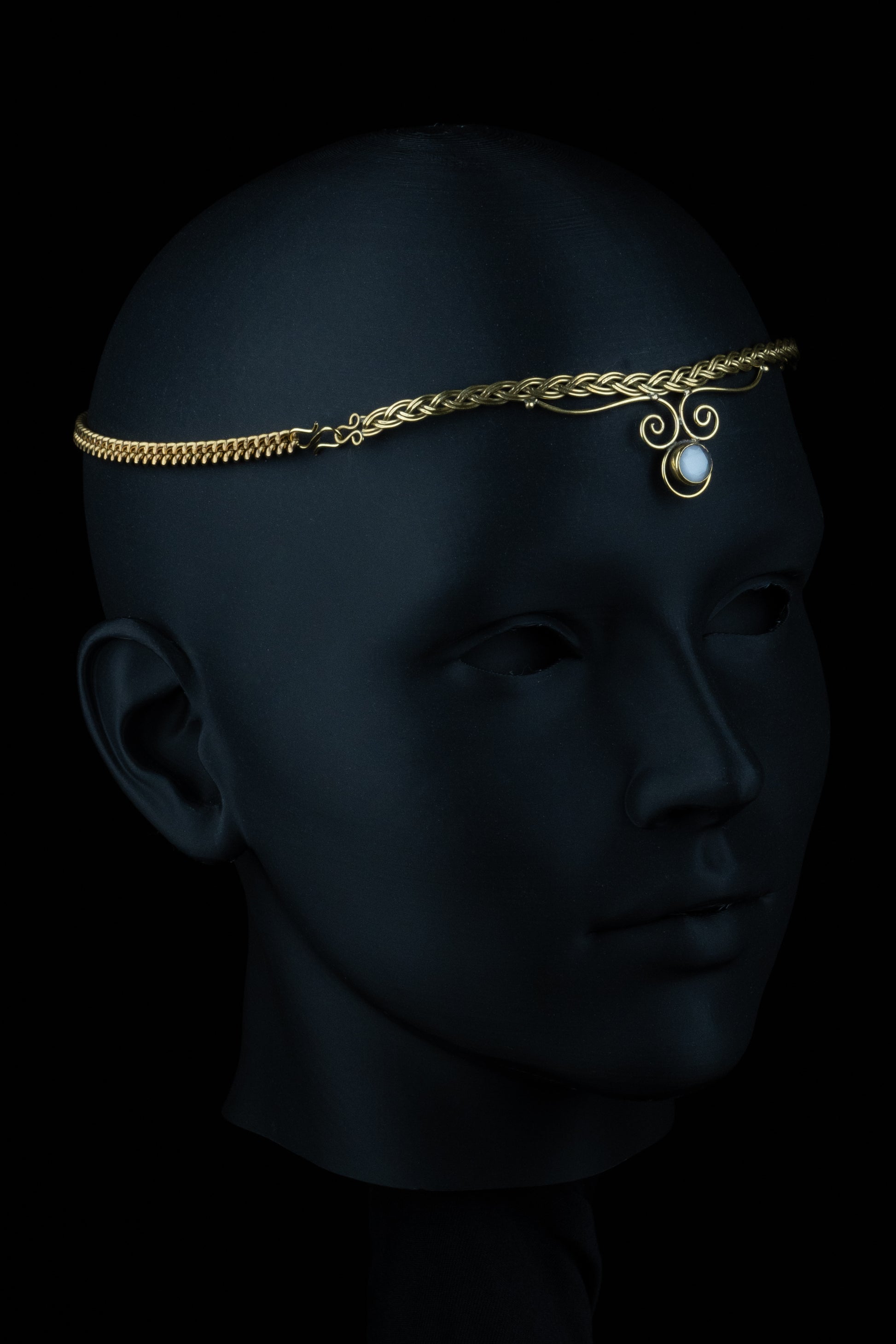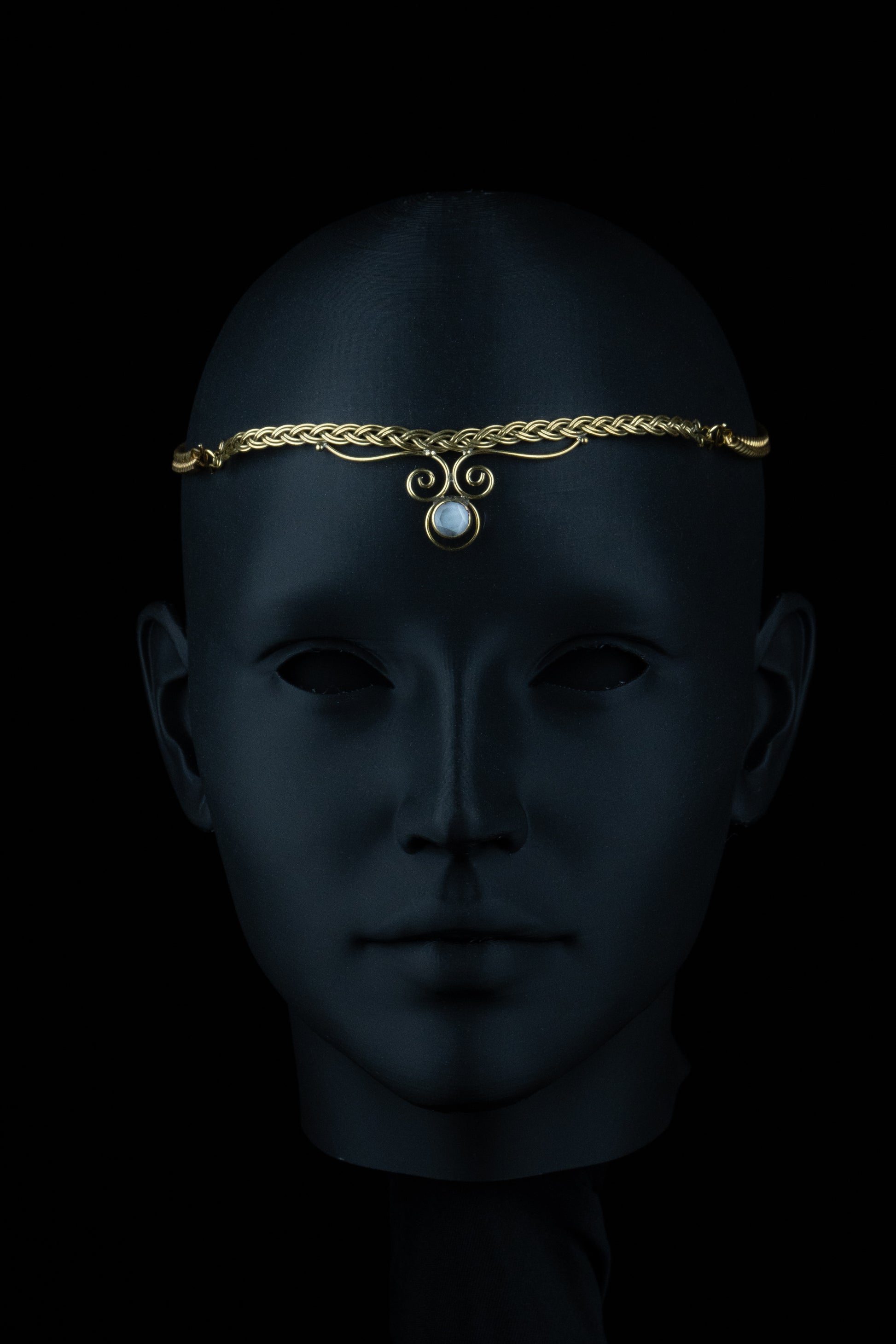 Its braided band encircles the brow like a soft incantation, while a single glowing gem rests beneath twin spirals of brass.