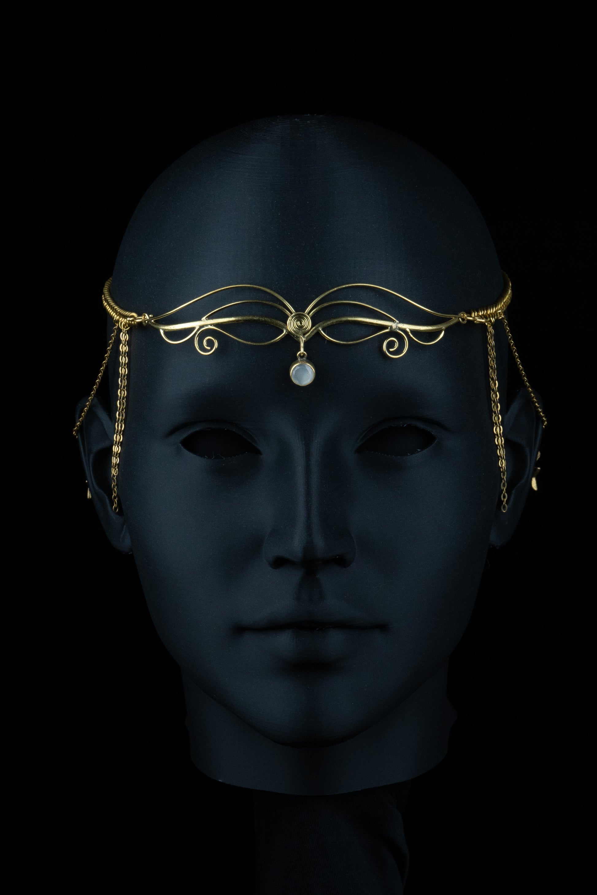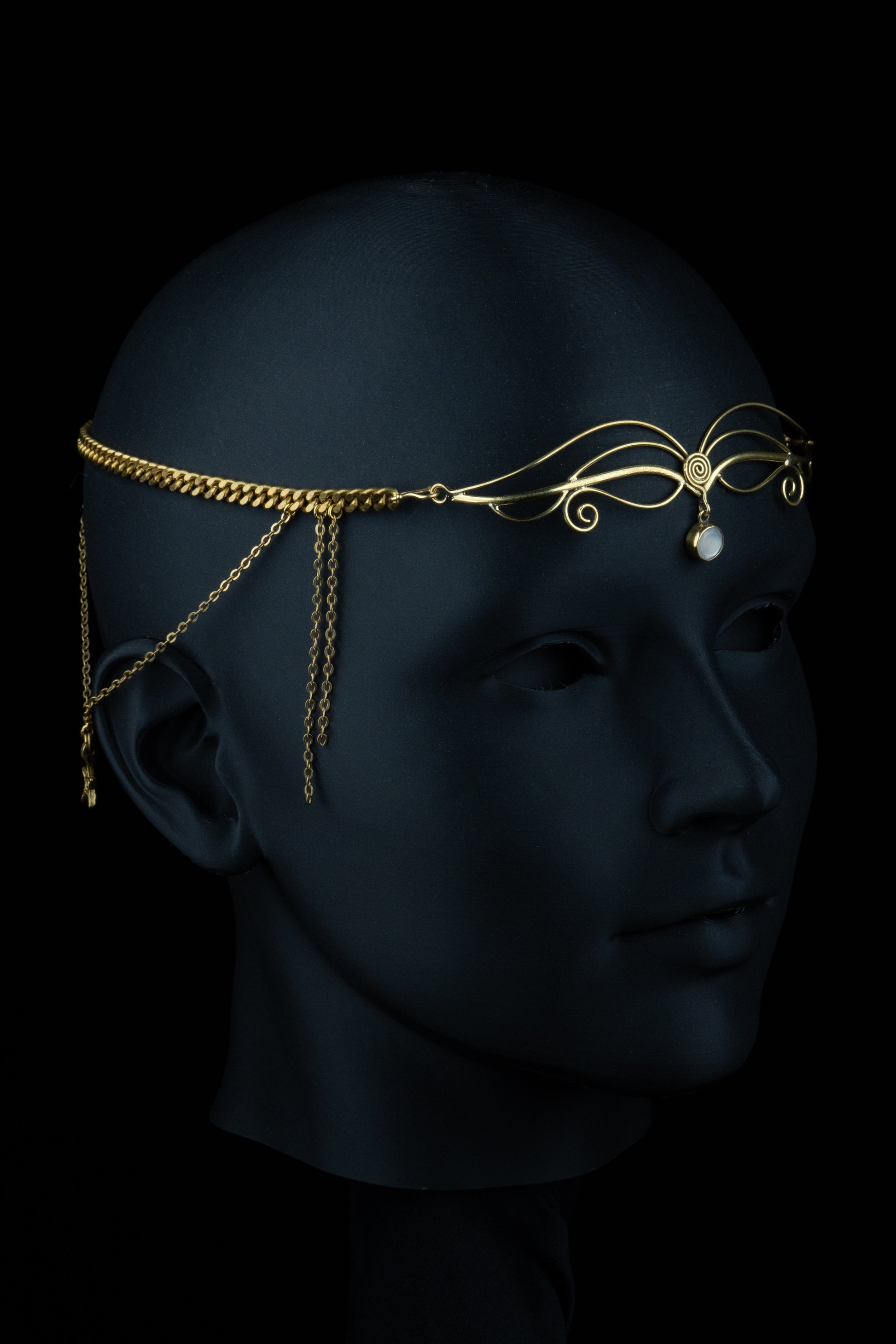 Handmade with welded brass wire, chain, and moonstone, this crown curves in graceful arcs like the wings of a duskbird mid-flight.