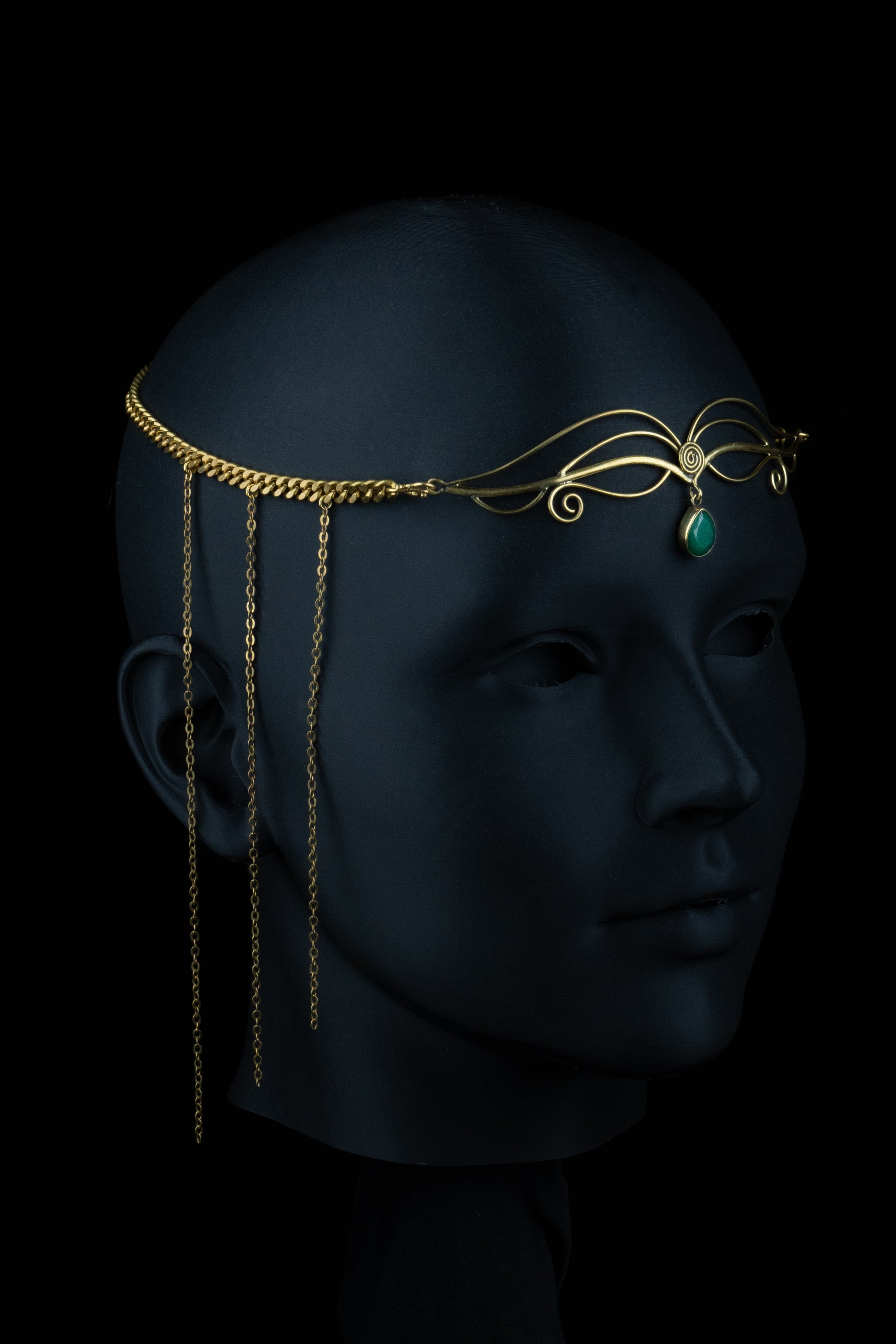 Handmade with welded brass wire, chain, and zircon, this crown curves in quiet arcs like leaflines on still water.