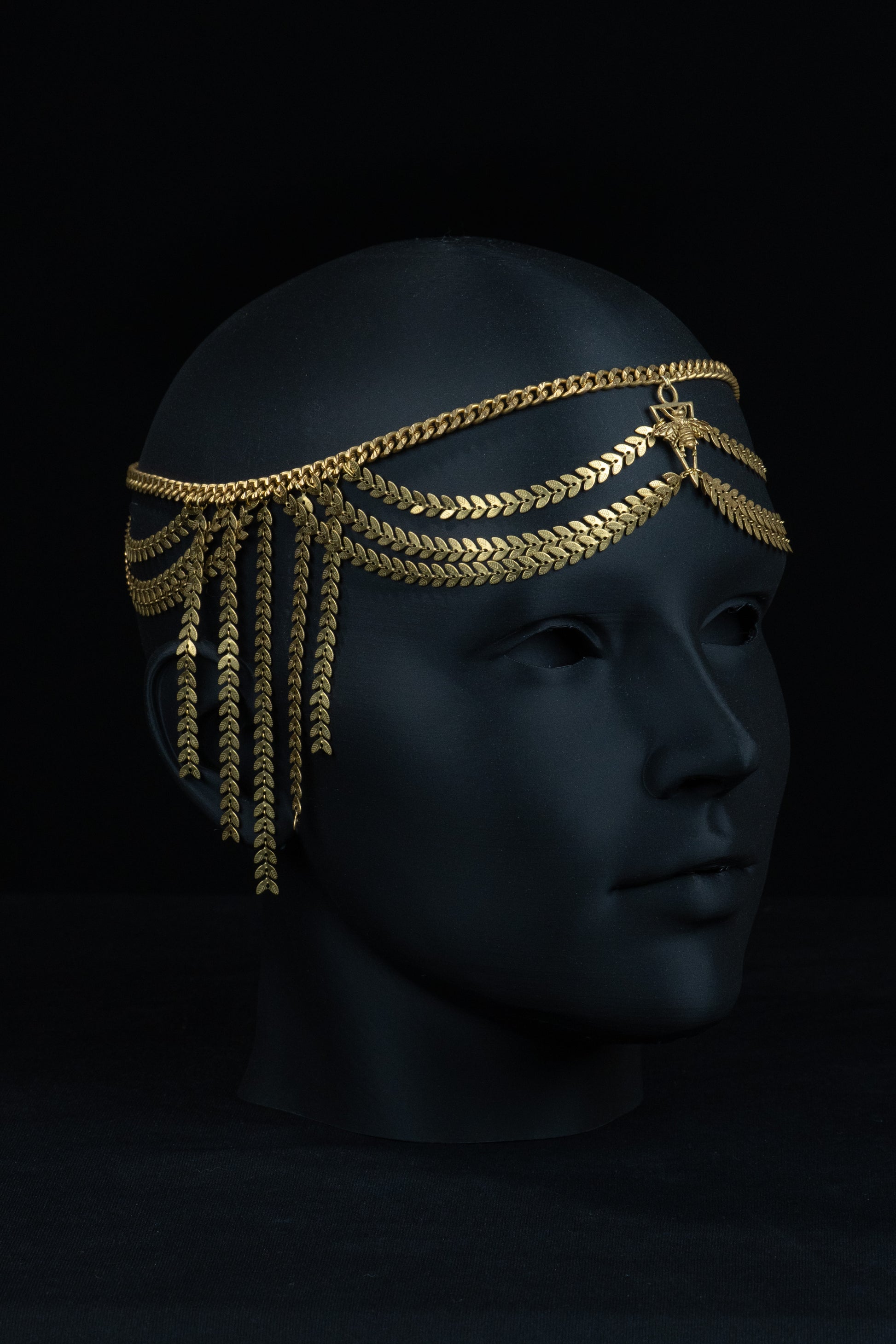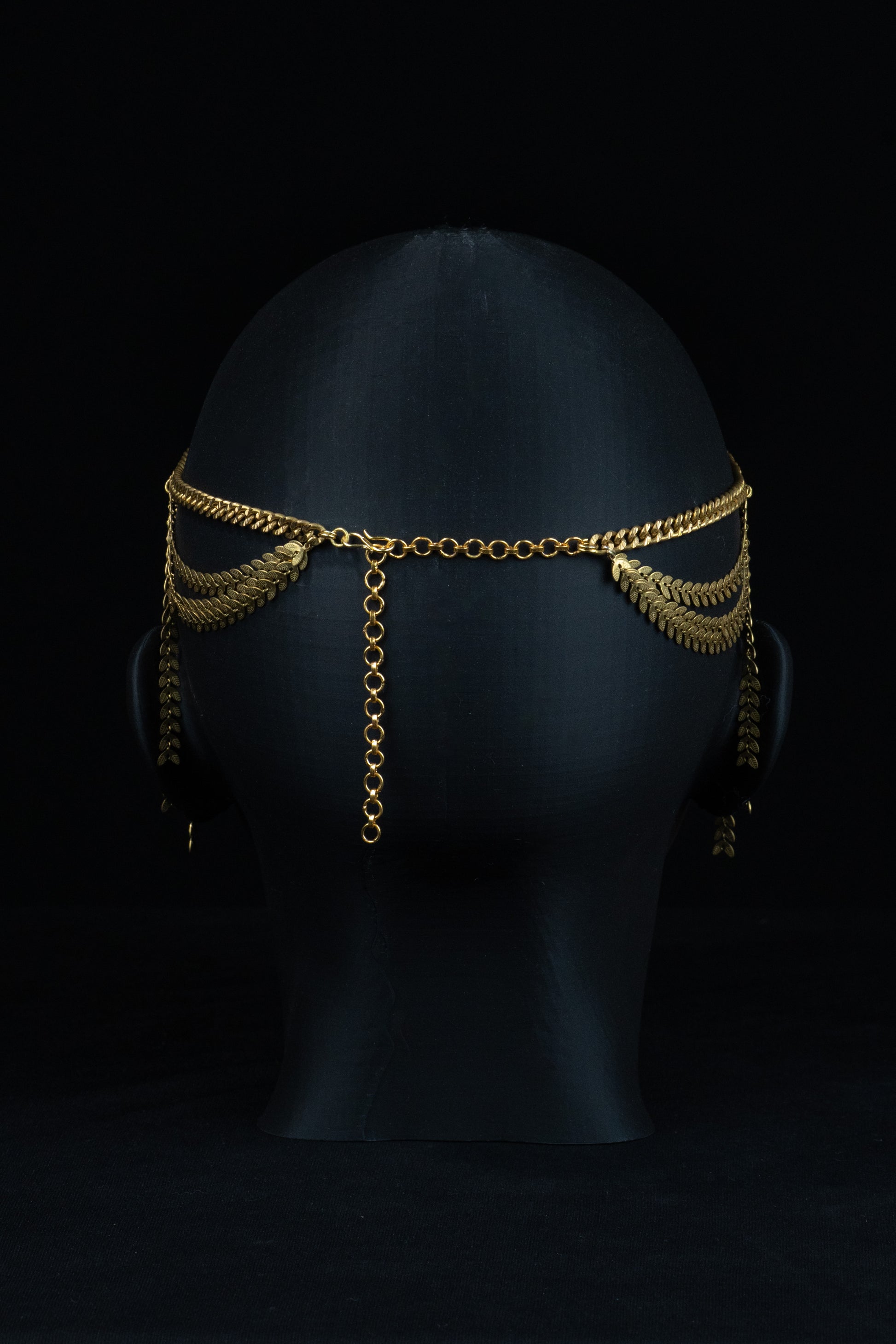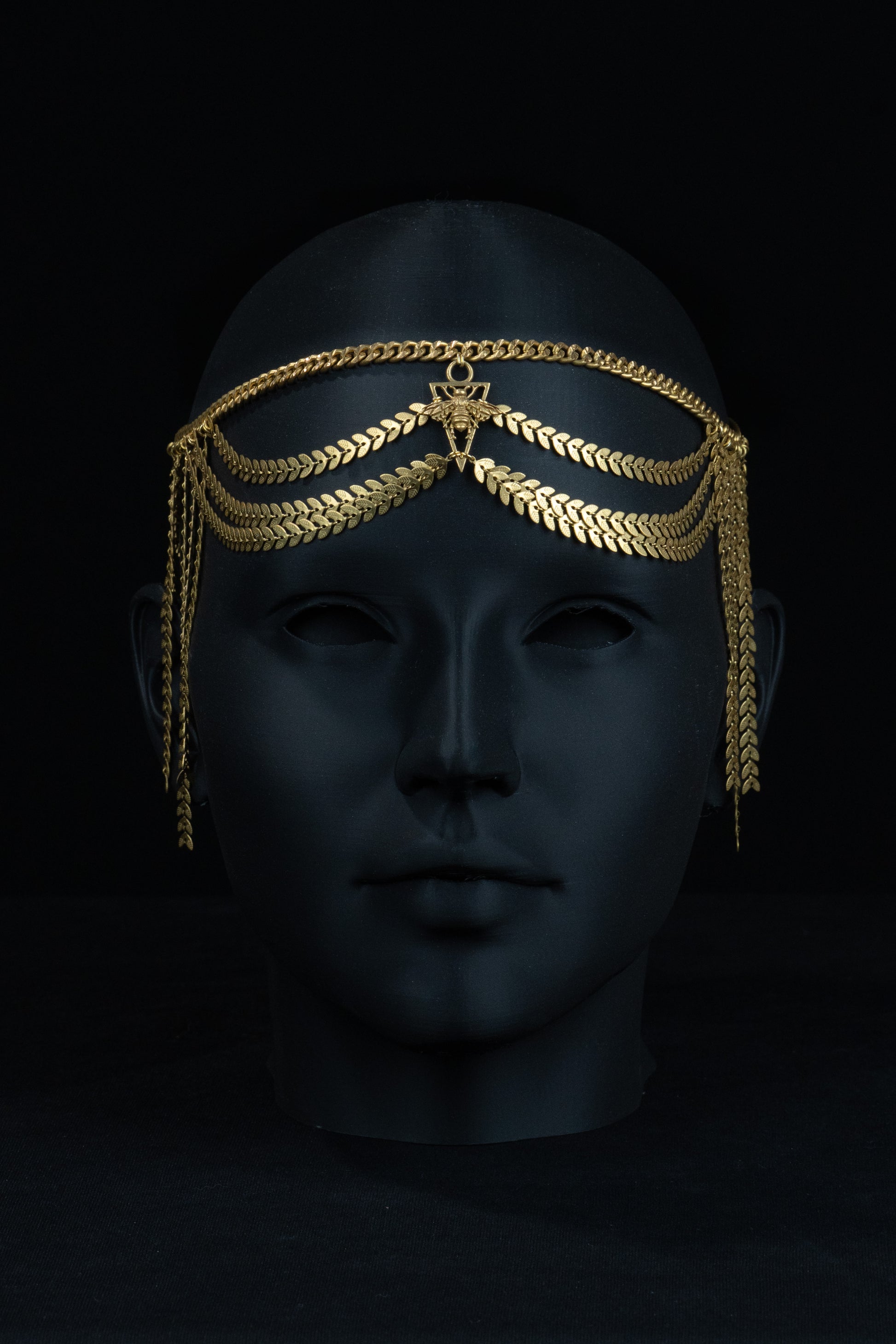 Crafted in brass, this handmade circlet weaves a cascade of leaf-like chains, crowned by a sacred geometry bee emblem—symbol of harmony, diligence, and divine order.