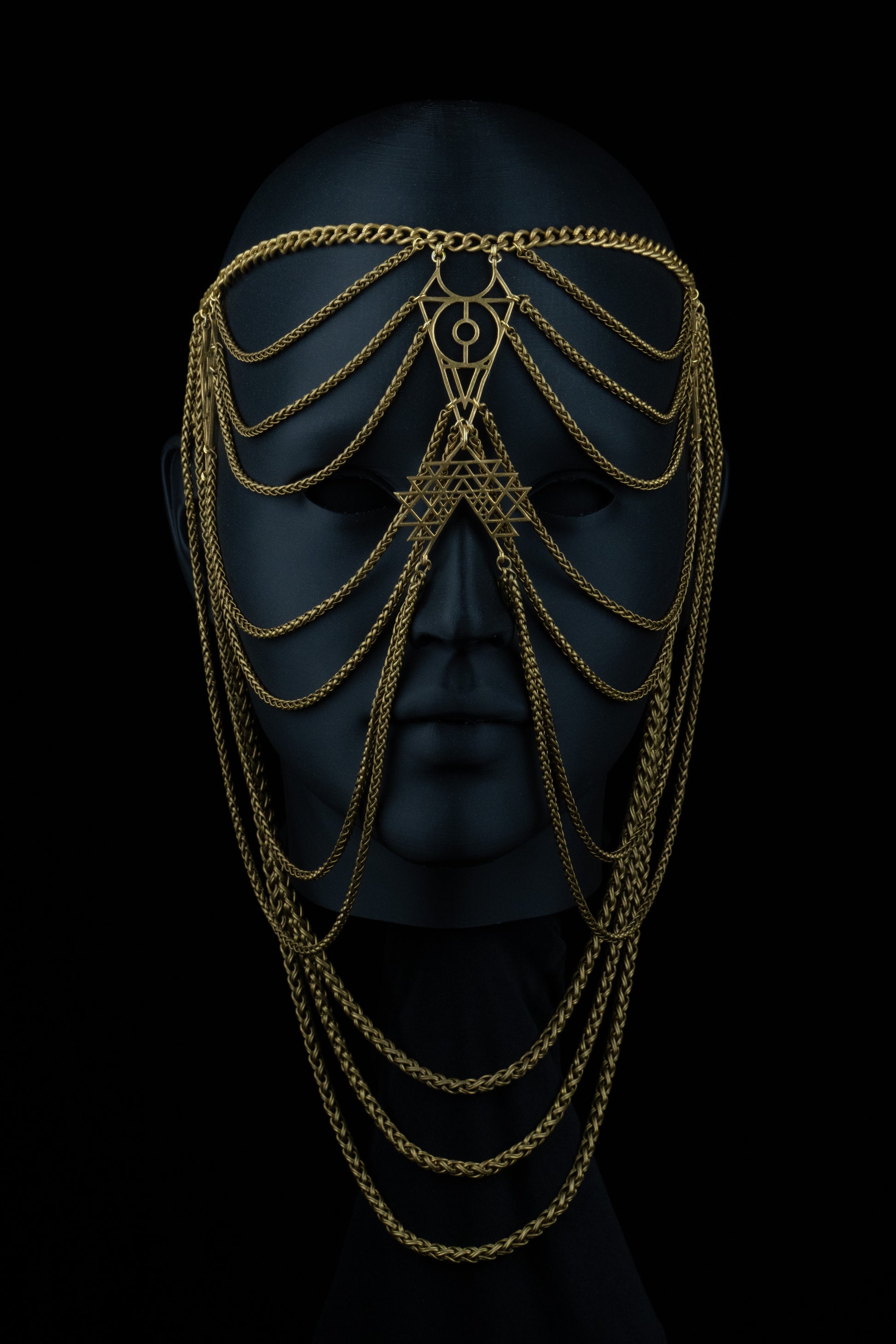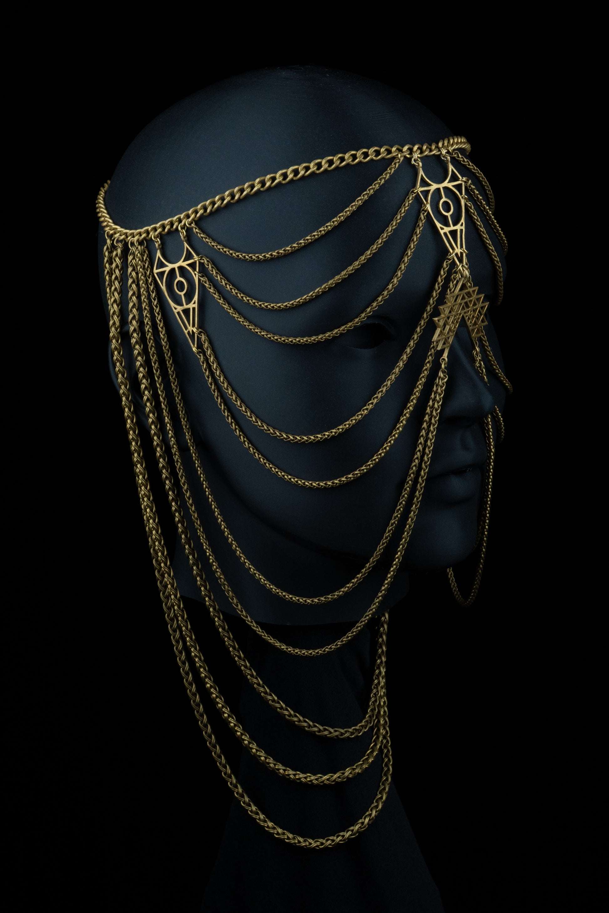 A one-of-a-kind brass headpiece inspired by the ceremonial helms of ancient warrior-priests.