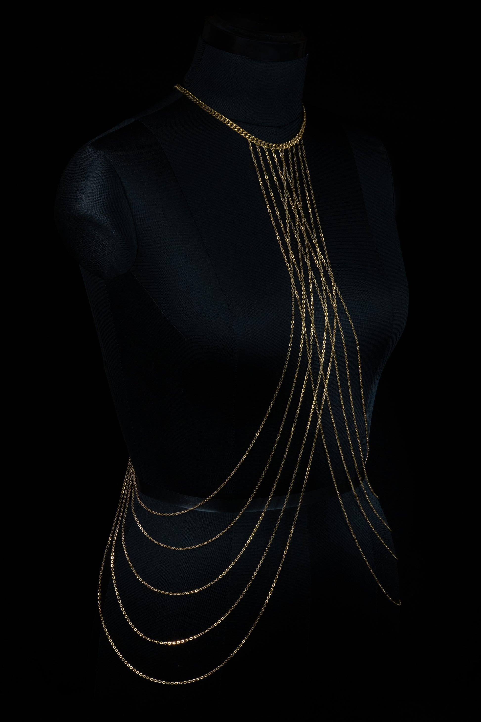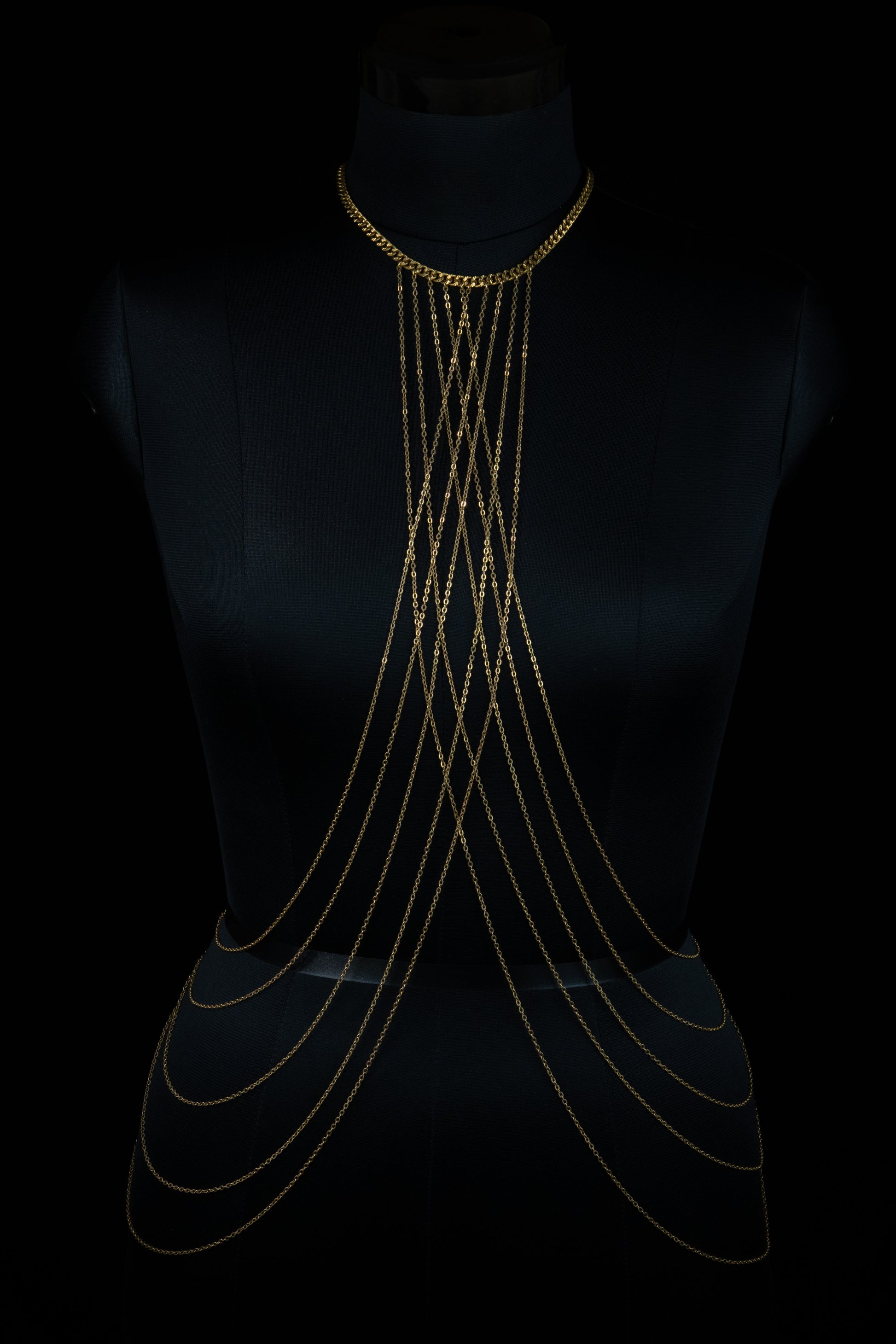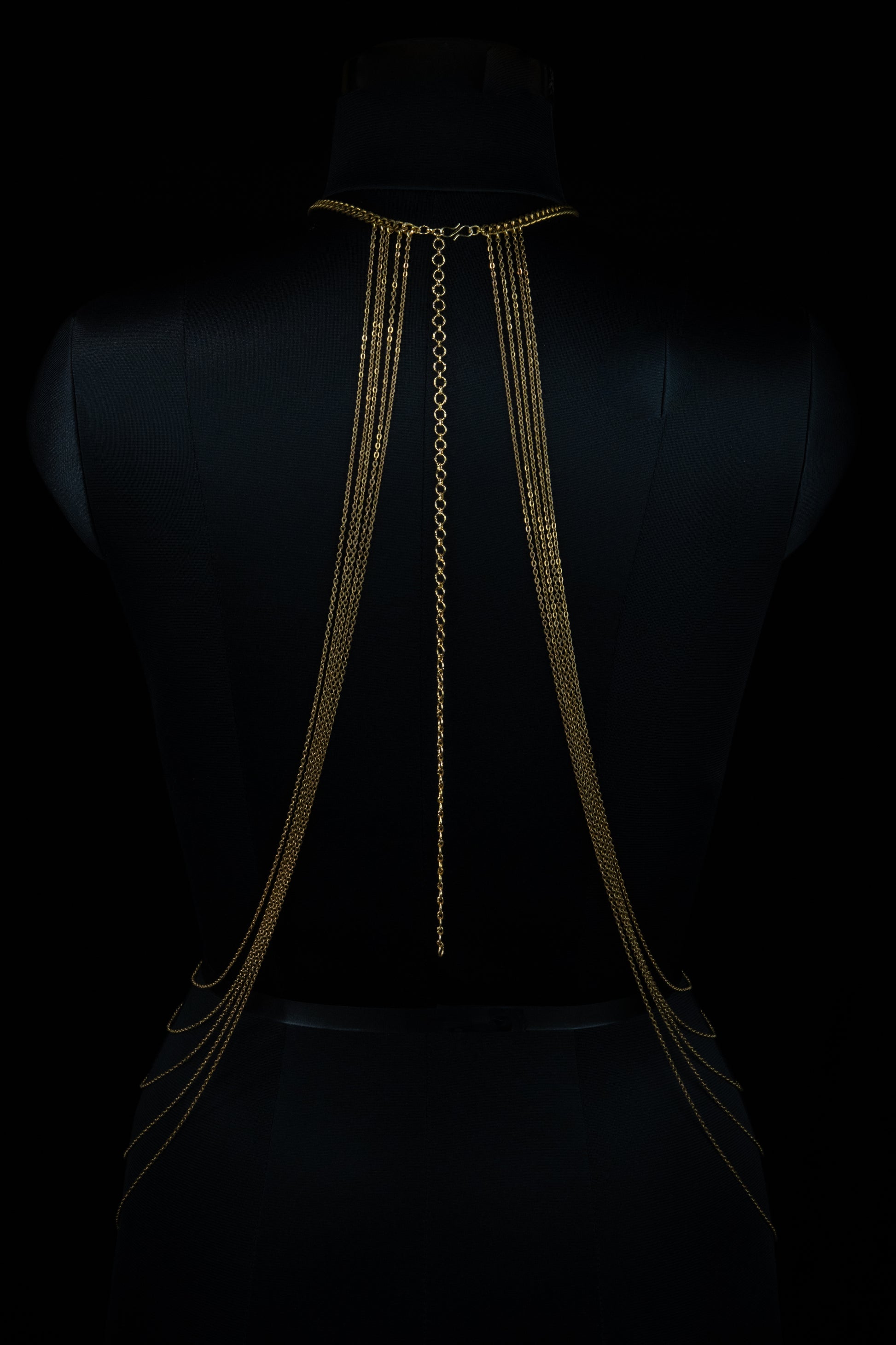 A golden hymn of movement and grace, Golden Hymn drapes the body in cascading arcs—each chain a note in a secret melody.